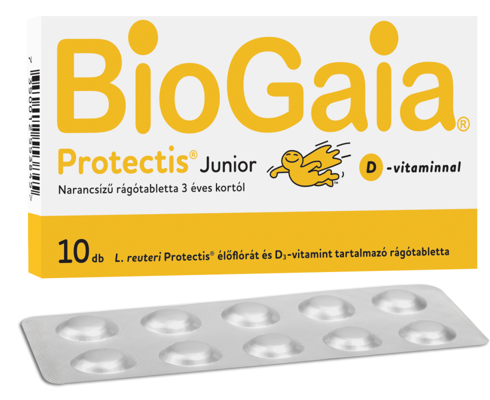 BioGaia Protectis Junior + D-vitamin, étrend-kiegészítő rágótabletta, 3 éves kortól, 30 db